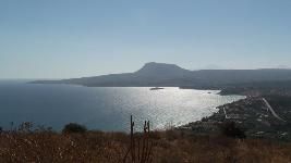 Ausgangspunkt für eine eindrückliche Wanderung auf Rodopos ist die gleichnamige Ortschaft. Der Weg führt vorerst einmal über eine geteerte Strasse in nördlicher Richtung. Nach wenigen Km, am Ende der mit Trauben und Gemüse bebauten Felder, ist nur noch eine Schotterstrasse vorhanden, welche über einen kleinen Pass zum Agios Ioannis Gionis führt. Kaum hat man den Passeinschnitt (Bild) durchquert, eröffnet sich ein wundervoller Blick zur Kapelle hinunter, aber auch hinüber zur Halbinsel Gramvousa. Von der Kapelle aus folgt man dem Fahrsträsschen, an einigen Feldern vorbei bis zu einer Spitzkehre. Von hier führt das Strässchen noch zu einer weiteren Kapelle (Agios Pavlos). Exakt in der Spitzkehre beginnt ein Fussweg, der mit Steinmännchen und roten Punkten markiert ist. Bis nach Rodopos sind es noch gut 2h (Insgesamt etwa 5h). Information zur Wanderung: AllTrails.