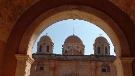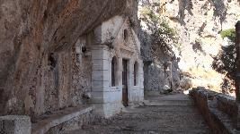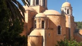 Auf der Akrotiri-Halbinsel sozusagen gleich gegenüber, gibt es einige Klöster zu bewundern. Beginnen kann man die Besichtigung beim Moni Agia Triada, wobei die Anreise entlang dem Ormos Soudas über Chania führt, dann weiter am Flughafen vorbei. Nach der Besichtigung folgt man dem kleinen Fahrweg durch eine Schlucht zum Moni Gouverneto. Wie eine Festung steht das Kloster in der kahlen Landschaft. Von hier führt ein wundervoller, breiter Fussweg hinunter zum verlassenen Moni Katholiko. Unterwegs kommt man an der Bärenhöhle mit Tropfsteinaltar und Kapelle vorbei. Wanderer mit Ausdauer können vom Kloster weiter durch die Schlucht bis zum Meer hinunter, oder gar zur Ortschaft Stavros, die etwa in drei Stunden erreichbar ist. Dort gibt es hübsche Tavernen und eine herrliche Bucht zum Schwimmen. Wanderführer Kreta vom Michael Müller Verlag: Tour 4.