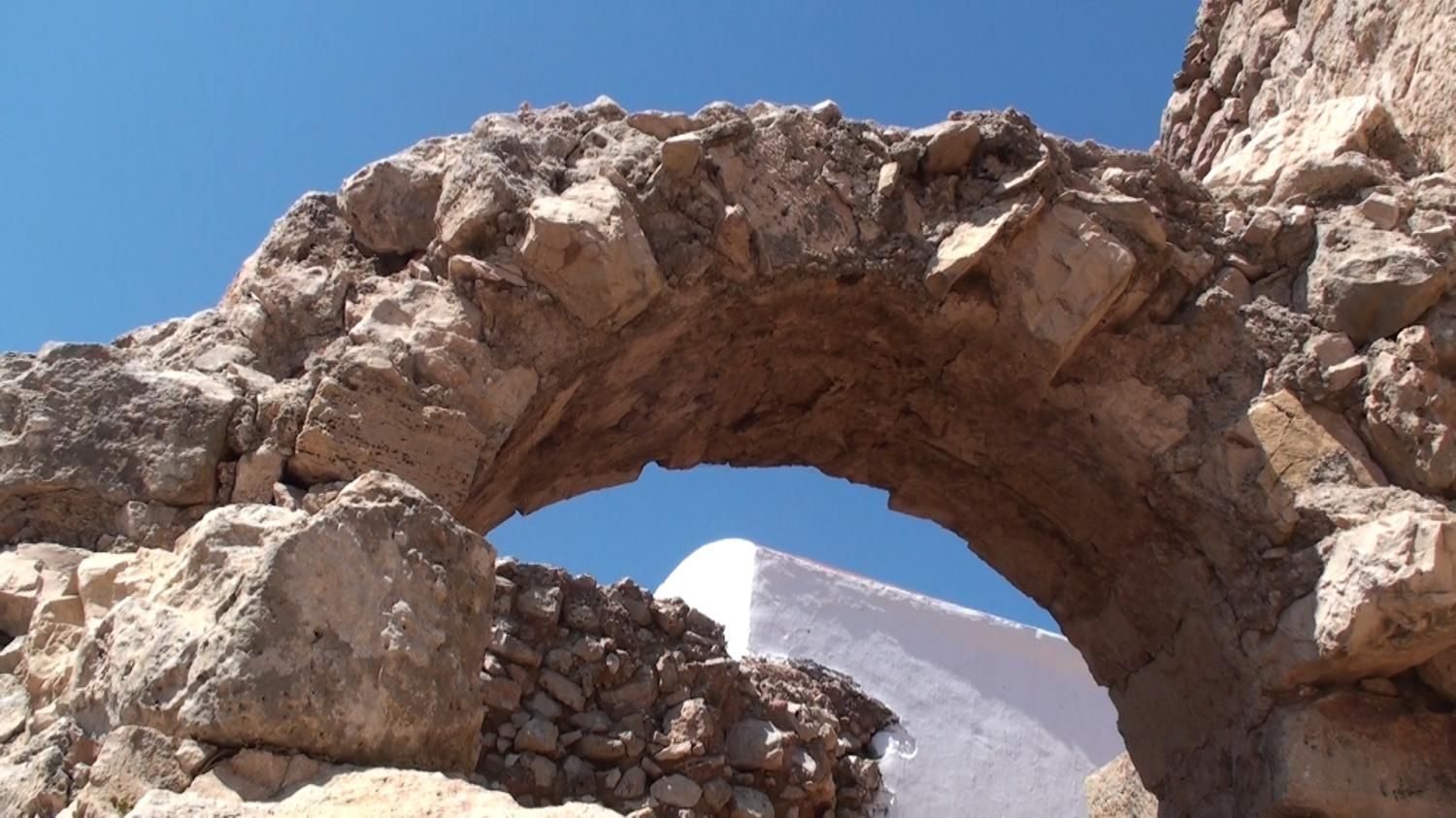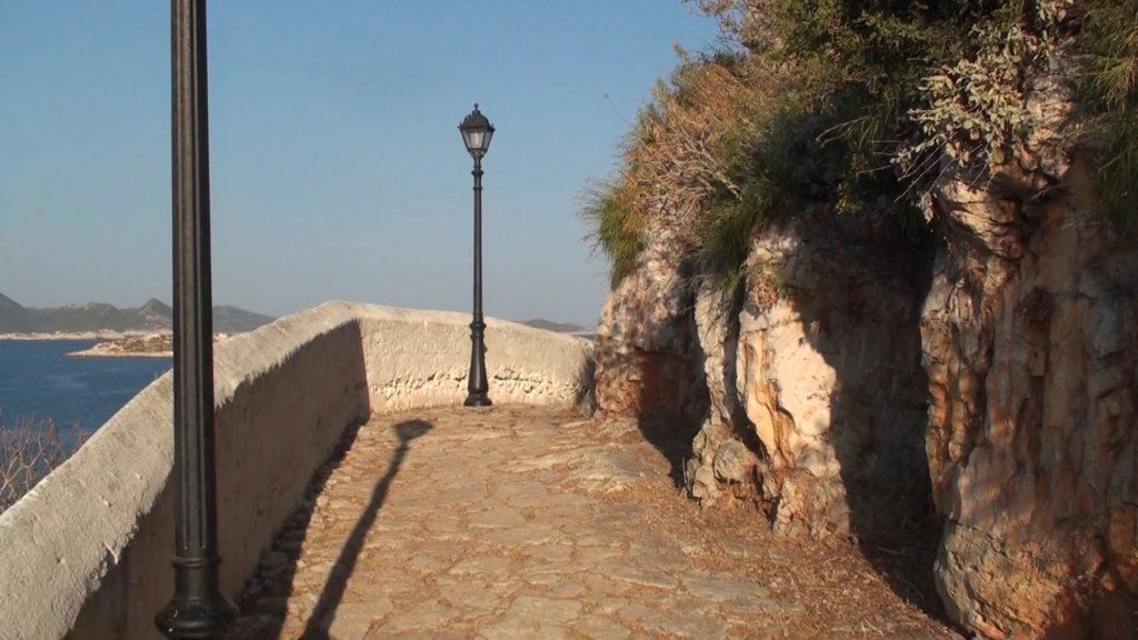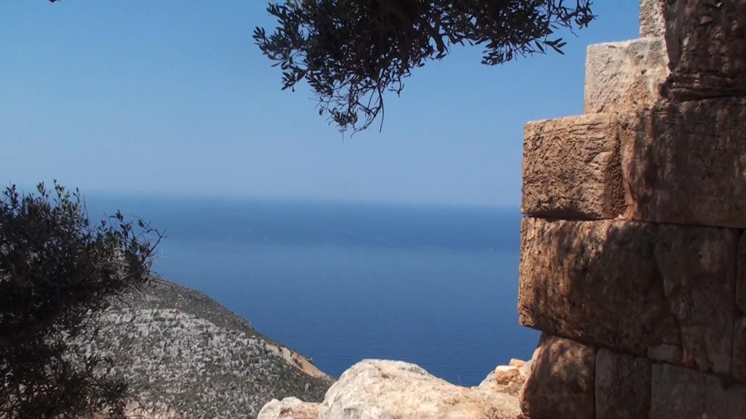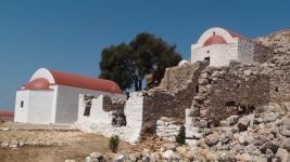 Eine weitere eindrückliche Tour führt uns zum Paleokastro einer ehemaligen Befestigung mit drei Kapellen auf dem höchsten Berg der Insel, dem Vigla. Von Megisti geht man kurz entlang der Strasse zum Flughafen. Die grosse Kurve welche bei der Garnison vorbeiführt kann man abkürzen und kommt direkt zur Agia Triada. Nach einem weiteren kurzen Stück auf der Strasse erkennen wir einen breiten Weg der steil bergan führt. Man folgt diesem Kalderimi und sieht schon bald das Ziel in der Höhe.