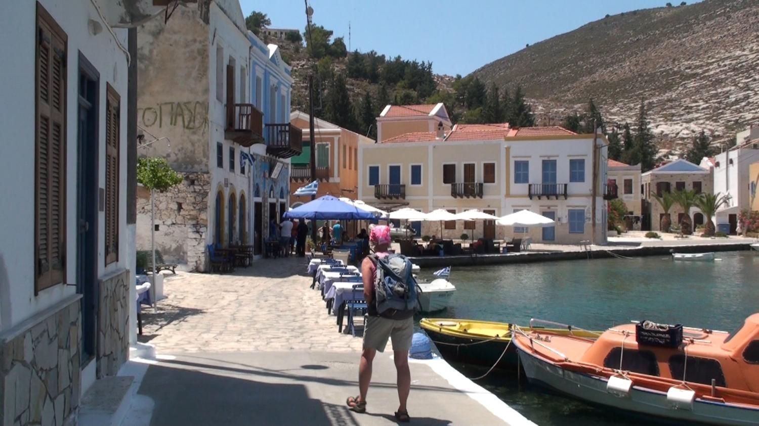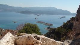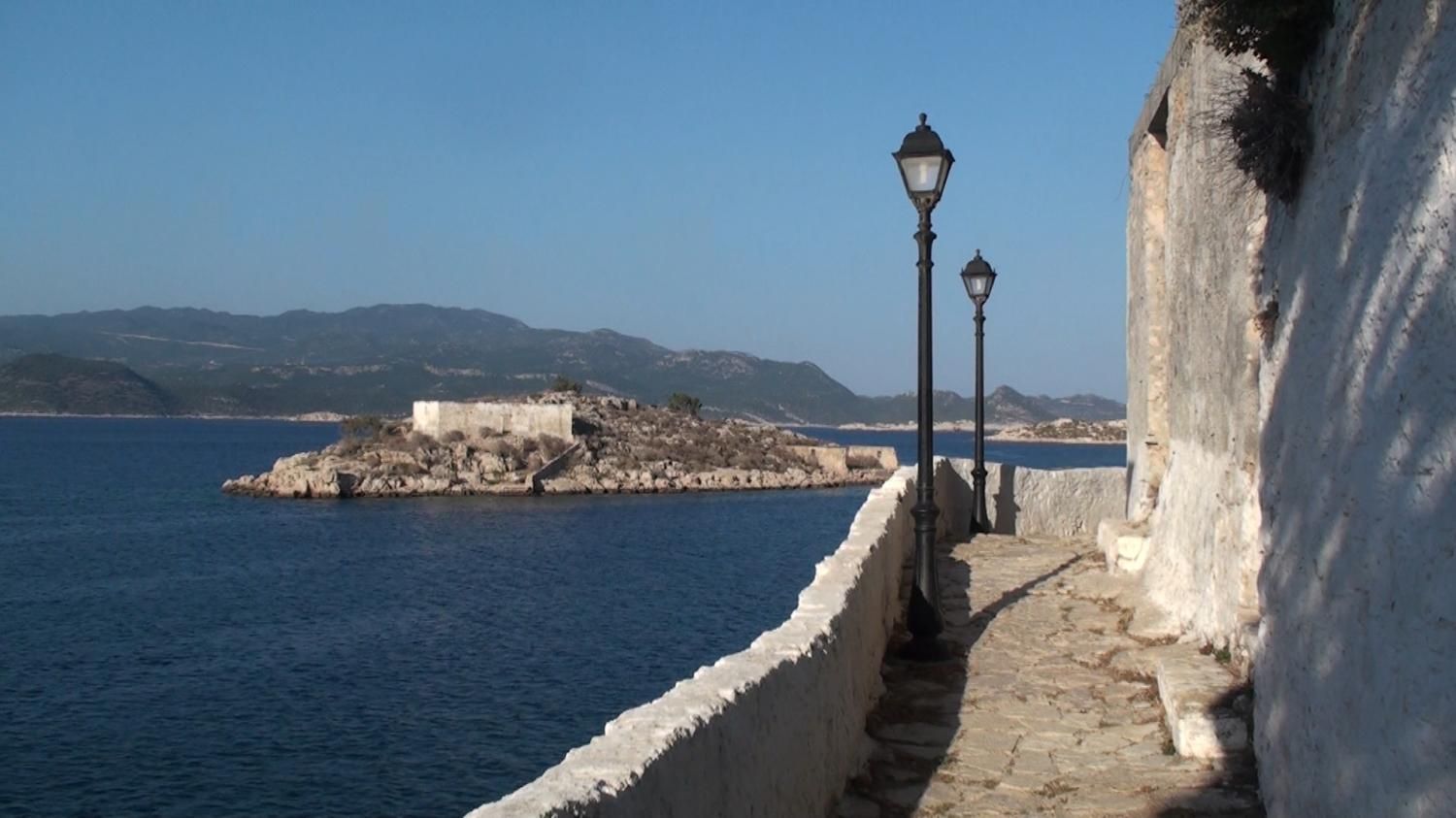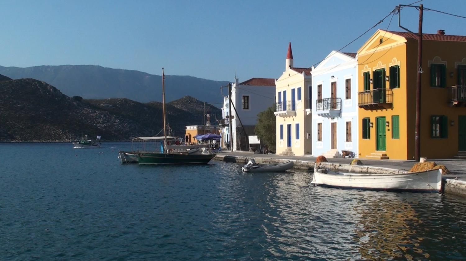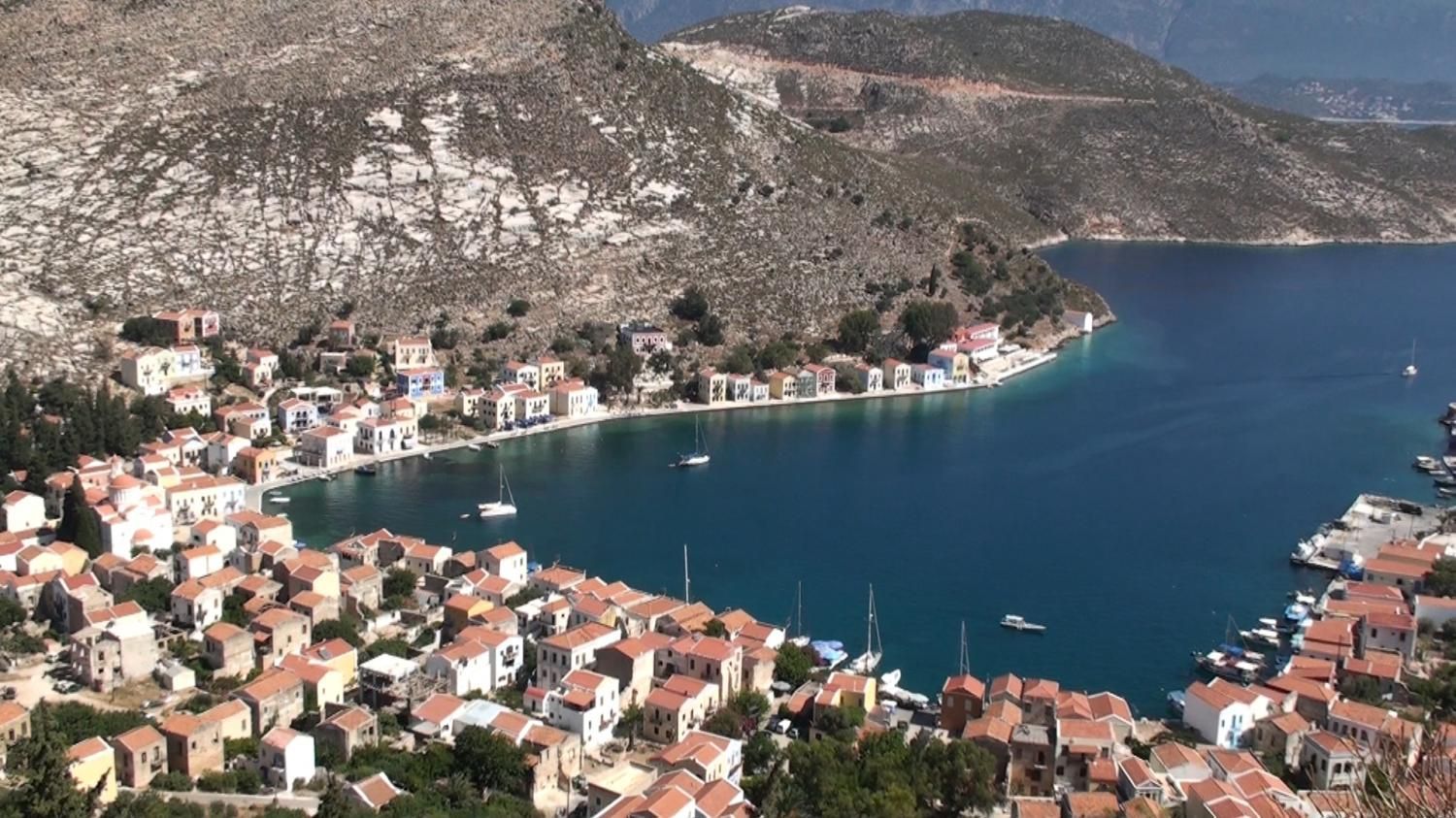 Wird auch als „Aussenposten Europas“ bezeichnet, denn diese winzige Insel liegt nur einen „Steinwurf“ weit entfernt von der Türkei, ganz am östlichen Rand der Ägäis. Durch seine Lage bedingt, haben viele Mächte die Insel beherrscht (Türken, Franzosen, Engländer u. Italiener). In den zwanziger Jahren des letzten Jahrhunderts diente Kastellorizo den Franzosen als Landeplatz für ihre Wasserflugzeuge, welche auf dem Weg nach Indien waren. Im 1. Weltkrieg erbauten die Franzosen von den Schiffsanlegestellen am Meer, hinauf auf die schattenlose Hochebene Rampen, um ihre Geschütze dorthin hoch zu ziehen. Eine Wanderung zu einem dieser noch gut erhaltenen Bauwerke ist empfehlenswert! Überhaupt bietet dieses Eiland einige Möglichkeiten „per pedes“ tolle Orte kennen zu lernen. Meist ist aber ein steiler 200m hoher Aufstieg zu bewältigen, denn hinter dem Hafenort Megisti ragt eine Felswand hinauf, die es zu überwinden gilt, will man auf der Hochebene die verschiedenen Sehenswürdigkeiten erwandern. Zu erwähnen ist ein Kloster das dem Agios Georgios sto vouno gewidmet ist, sowie die antiken Weinkelter mit Namen „Patitiria“ und das von dorischen Steinquader umrandete Paleochora mit seinen drei Kapellen. Megisti als Ort bekundet viel Charme. Nicht vergeblich wurde es einst „Mikro Parisi“, Klein Paris genannt. An der Hafenpromenade reiht sich eine Taverne an die andere. Die dazugehörenden Häuser sind meist gut erhalten und im neoklassizistischem Stil gebaut. Hat man Glück, kann man vom Tavernentisch aus eine Meeresschildkröte, eine „caretta“ beobachten, die im Hafenbecken schwimmt!