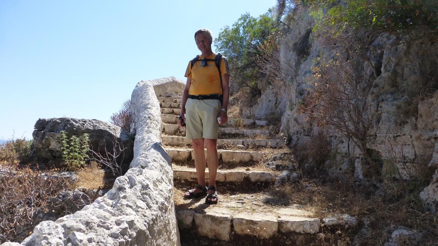 Von weither sichtbar ist das weisse Band der Treppe, welche auf das Hochplateau hinaufführt. Von Megisti haben die Bauern früher mit Eseln diesen Aufstieg bezwungen um Ihre Felder zu bestellen. Auch heute lohnt sich der Aufstieg, hat man doch einen phantastischen Blick zum Hafen von Megisti, dem einzigen Ort der winzigen Insel. Zudem gelangt man über diesen gut ausgebauten Weg zum Kloster Aghios Georgios tou Vounou, das bei unserem Besuch in Renovation war. In der Nähe des Klosters findet man zudem antike Weinkelter.